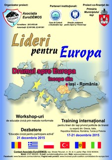 Aociatia EuroDEMOS implementeaza proiectul Lideri pentru Europa, proiect co-finantat de Primaria Municipiului Iasi. EuroDEMOS promoveaza cetatenia activa si participarea constienta a tinerilor la dezvoltarea comunitatii. Intelegerea functionarii sistemelor decizionale la nivel local ai European este importanta pentru asumarea politicilor publice si a evolutiei societatii.